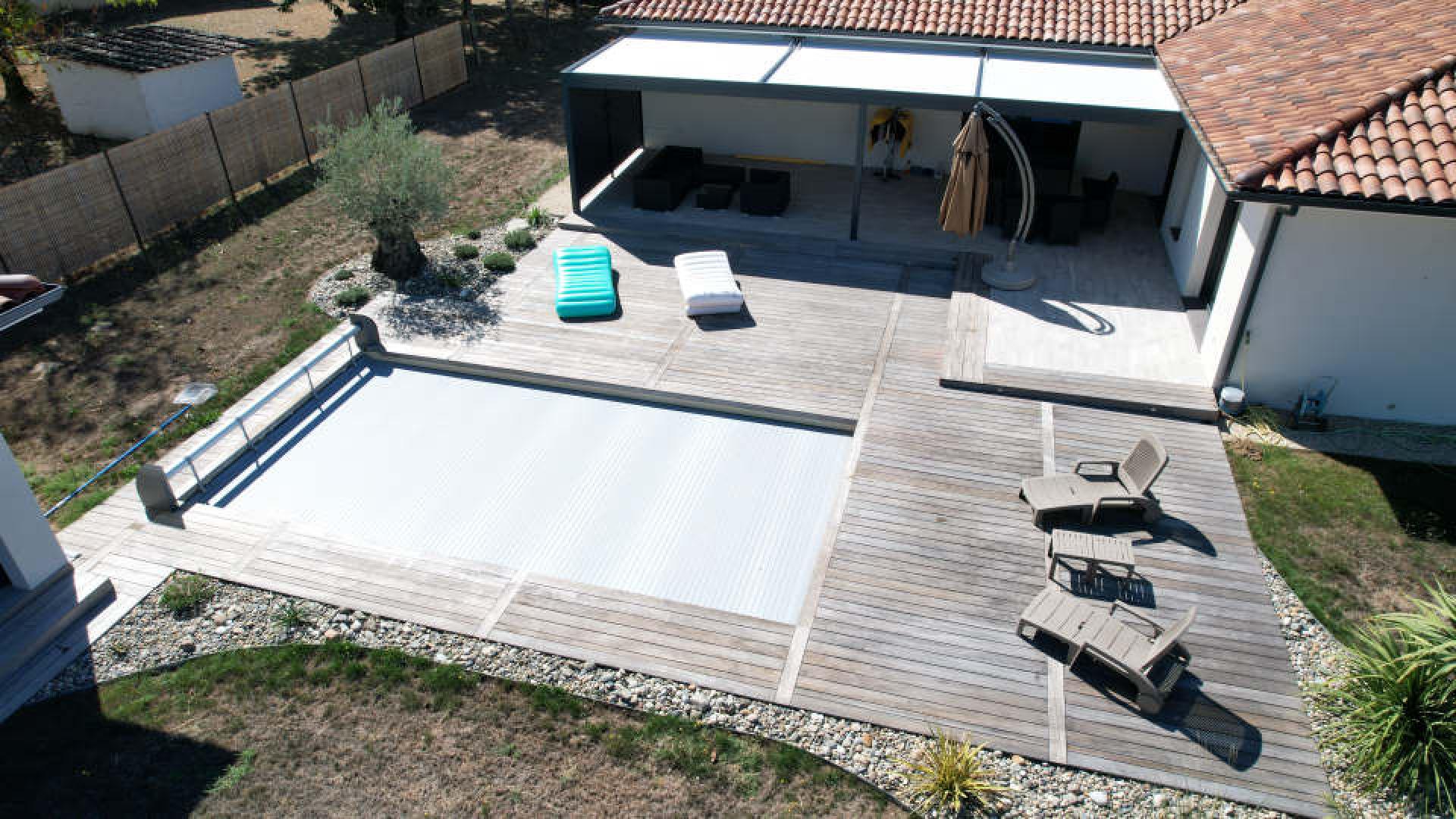 La terrasse piscine repose sur un lambourdage Douglas CL3b solide, renforcé par des poteaux Douglas et des pilotis bois et béton drainé. Une toile drainante 100 g/m² a été intégrée pour assurer la bonne évacuation de l’humidité et prolonger la durée de vie de l’ouvrage. L’ensemble est fixé avec des vis inox spécial terrasse, garantissant robustesse et sécurité.